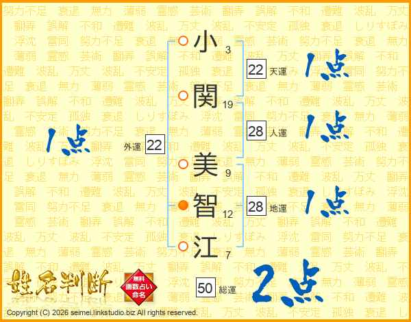 小(3画)関(19画) 美(9画)智(12画)江(7画)