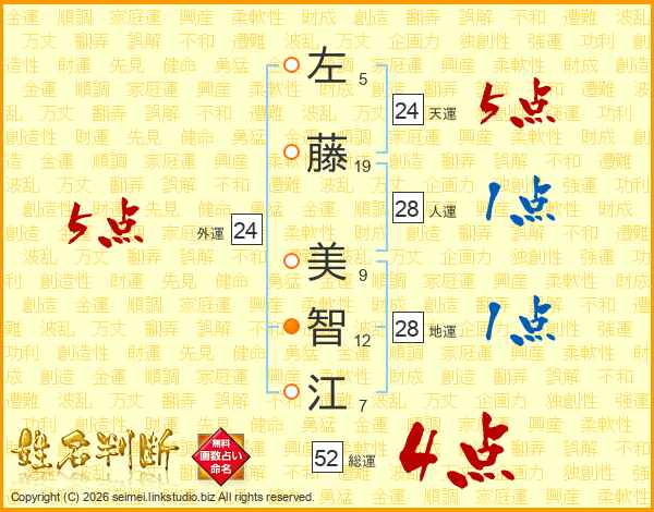 左(5画)藤(19画) 美(9画)智(12画)江(7画)