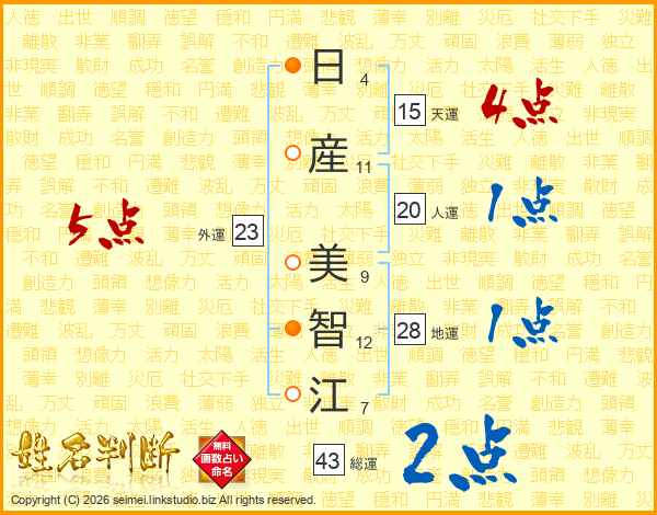 日(4画)産(11画) 美(9画)智(12画)江(7画)