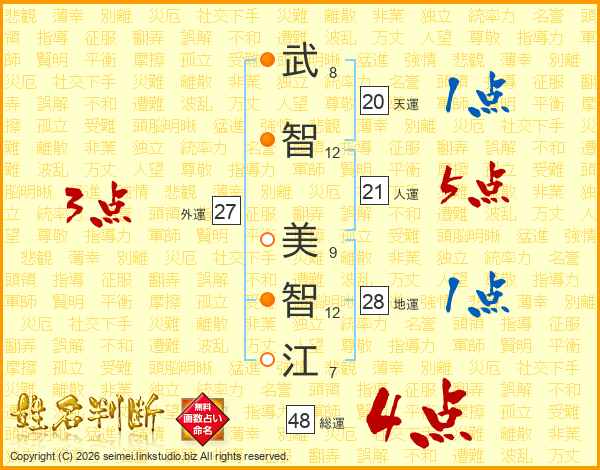武(8画)智(12画) 美(9画)智(12画)江(7画)