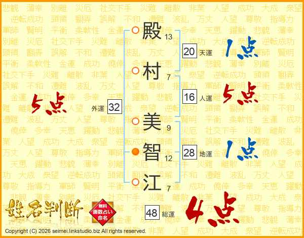 殿(13画)村(7画) 美(9画)智(12画)江(7画)