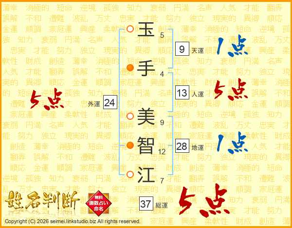 玉(5画)手(4画) 美(9画)智(12画)江(7画)
