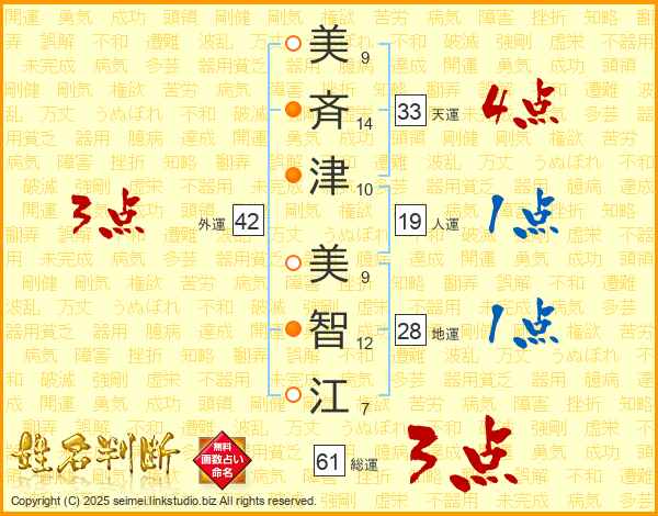 美(9画)斉(14画)津(10画) 美(9画)智(12画)江(7画)