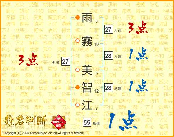 雨(8画)霧(19画) 美(9画)智(12画)江(7画)