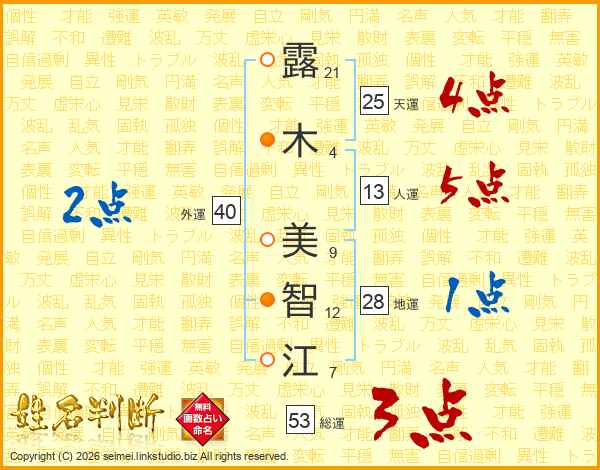 露(21画)木(4画) 美(9画)智(12画)江(7画)