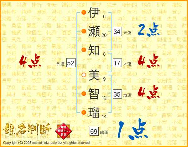 伊(6画)瀬(20画)知(8画) 美(9画)智(12画)瑠(14画)