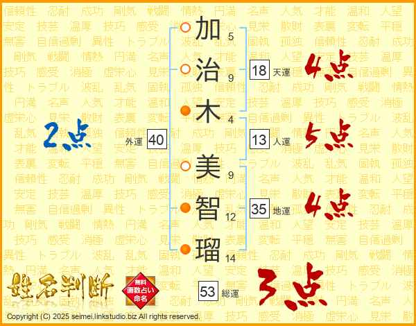 加(5画)治(9画)木(4画) 美(9画)智(12画)瑠(14画)