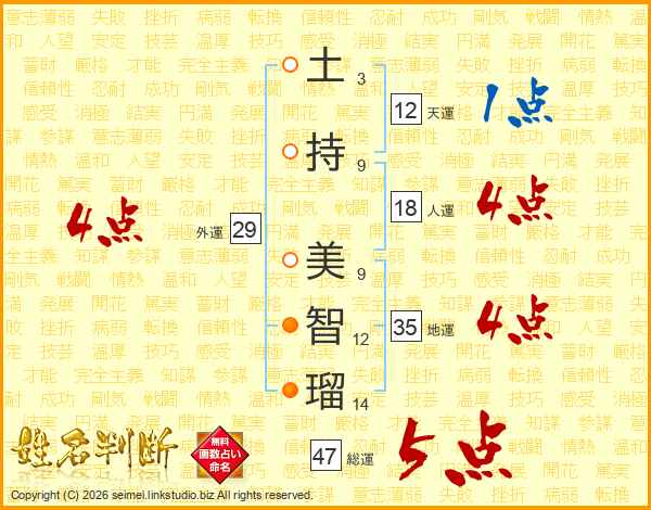 土(3画)持(9画) 美(9画)智(12画)瑠(14画)