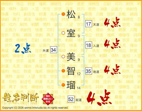 松(8画)室(9画) 美(9画)智(12画)瑠(14画)