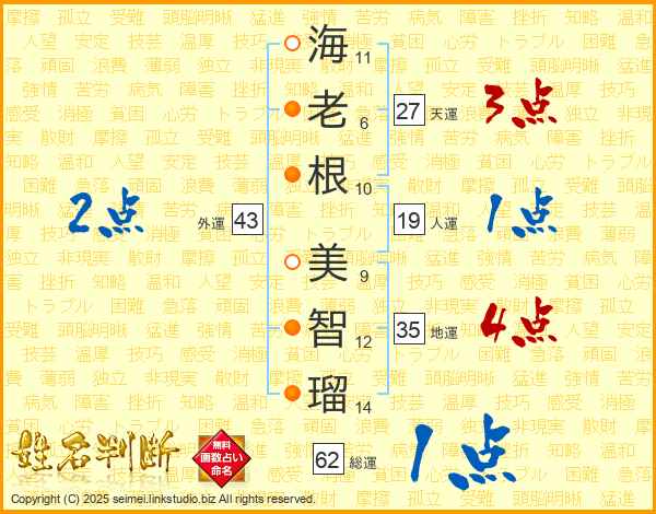 海(11画)老(6画)根(10画) 美(9画)智(12画)瑠(14画)