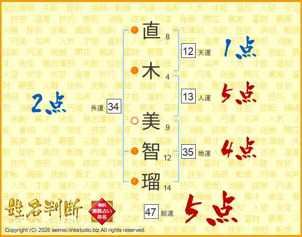 直(8画)木(4画) 美(9画)智(12画)瑠(14画)