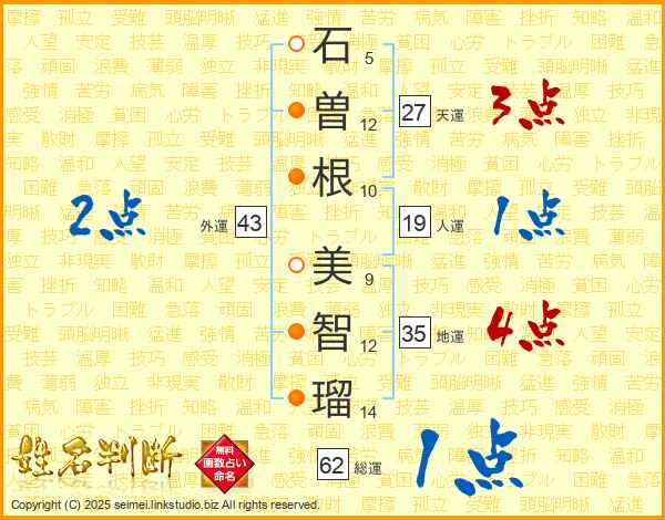 石(5画)曽(12画)根(10画) 美(9画)智(12画)瑠(14画)