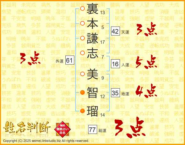 裏(13画)本(5画)謙(17画)志(7画) 美(9画)智(12画)瑠(14画)