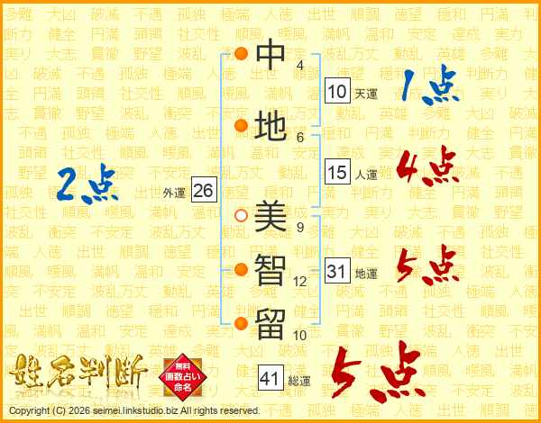 中(4画)地(6画) 美(9画)智(12画)留(10画)