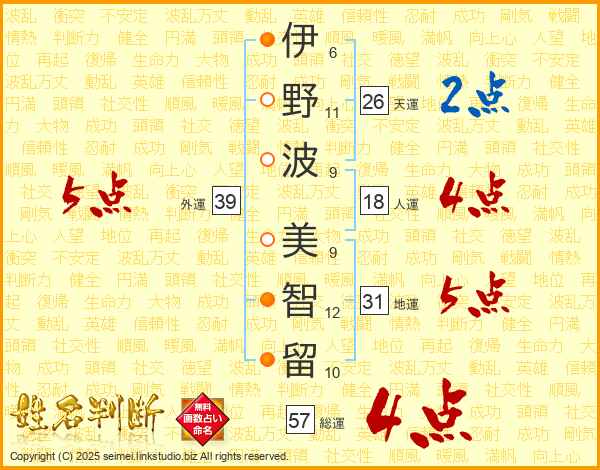 伊(6画)野(11画)波(9画) 美(9画)智(12画)留(10画)