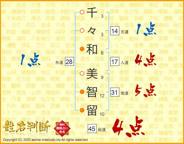 千(3画)々(3画)和(8画) 美(9画)智(12画)留(10画)