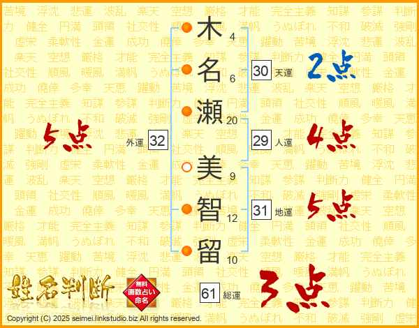 木(4画)名(6画)瀬(20画) 美(9画)智(12画)留(10画)