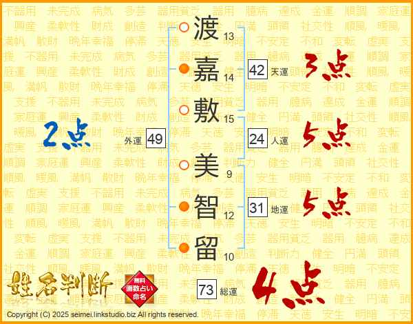 渡(13画)嘉(14画)敷(15画) 美(9画)智(12画)留(10画)