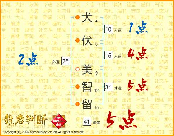 犬(4画)伏(6画) 美(9画)智(12画)留(10画)