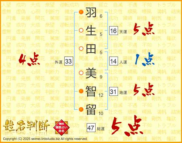 羽(6画)生(5画)田(5画) 美(9画)智(12画)留(10画)