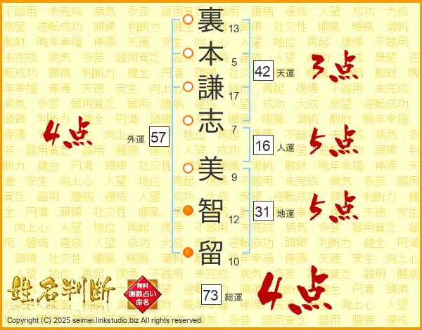 裏(13画)本(5画)謙(17画)志(7画) 美(9画)智(12画)留(10画)