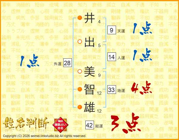 井(4画)出(5画) 美(9画)智(12画)雄(12画)