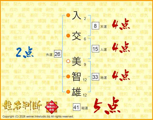 入(2画)交(6画) 美(9画)智(12画)雄(12画)