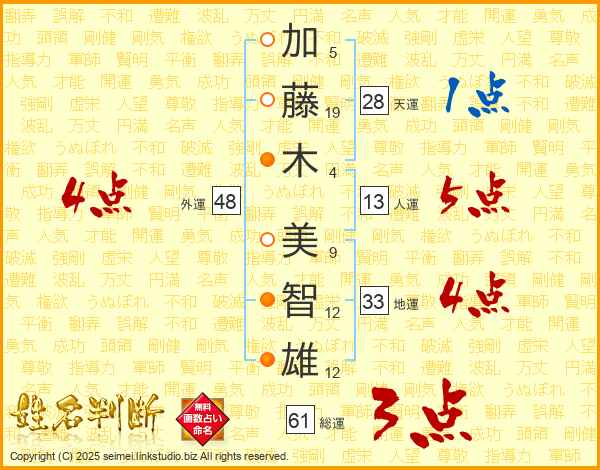 加(5画)藤(19画)木(4画) 美(9画)智(12画)雄(12画)