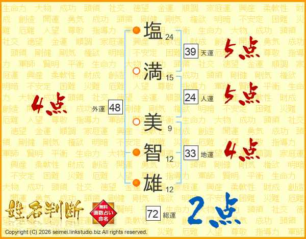 塩(24画)満(15画) 美(9画)智(12画)雄(12画)
