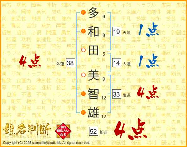 多(6画)和(8画)田(5画) 美(9画)智(12画)雄(12画)