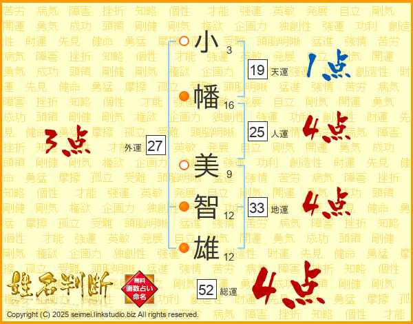 小(3画)幡(16画) 美(9画)智(12画)雄(12画)