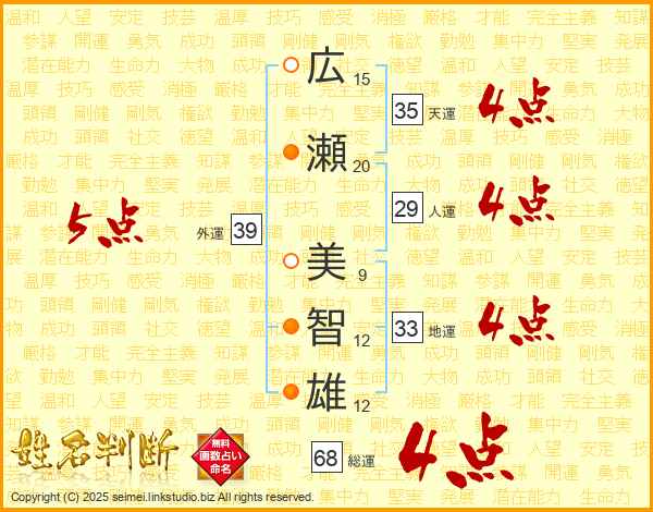 広(15画)瀬(20画) 美(9画)智(12画)雄(12画)