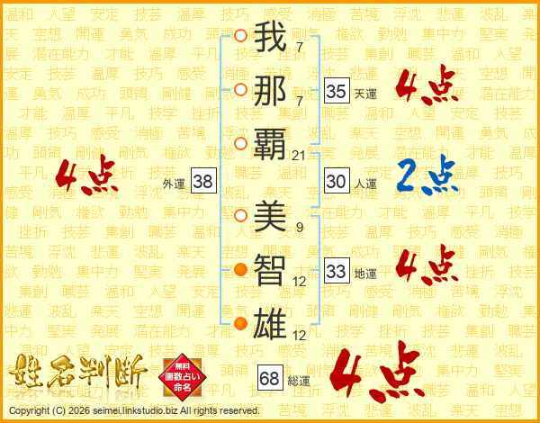 我(7画)那(7画)覇(21画) 美(9画)智(12画)雄(12画)
