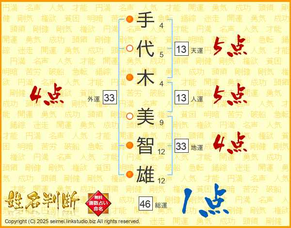 手(4画)代(5画)木(4画) 美(9画)智(12画)雄(12画)