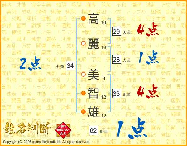 高(10画)麗(19画) 美(9画)智(12画)雄(12画)