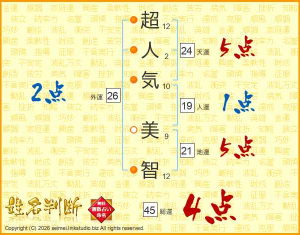 超(12画)人(2画)気(10画) 美(9画)智(12画)