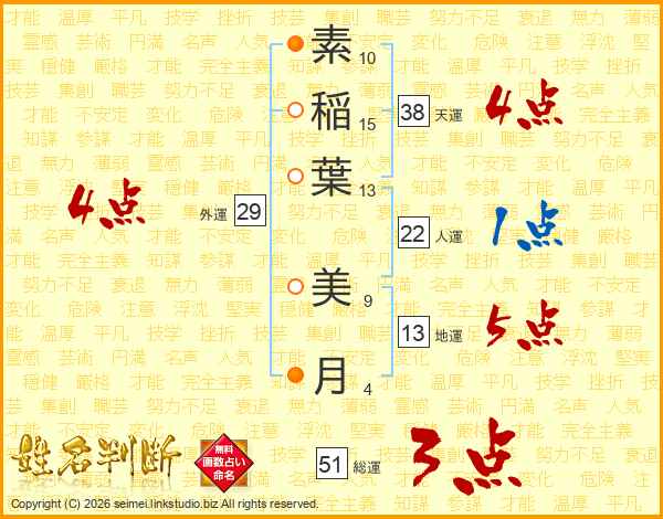 素(10画)稲(15画)葉(13画) 美(9画)月(4画)