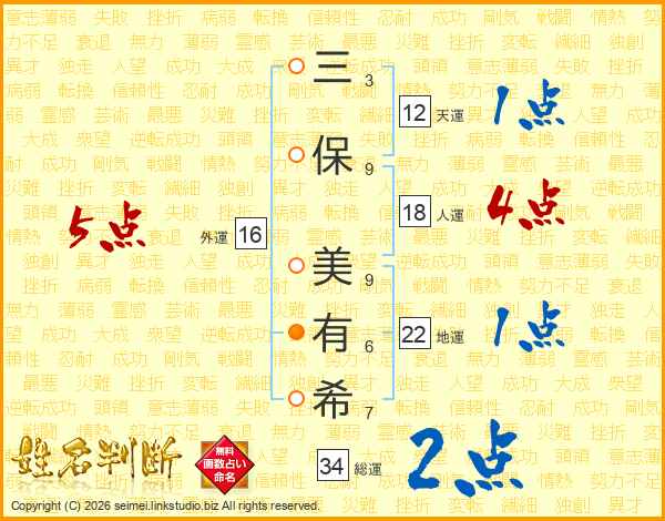 三(3画)保(9画) 美(9画)有(6画)希(7画)