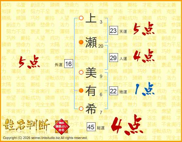 上(3画)瀬(20画) 美(9画)有(6画)希(7画)