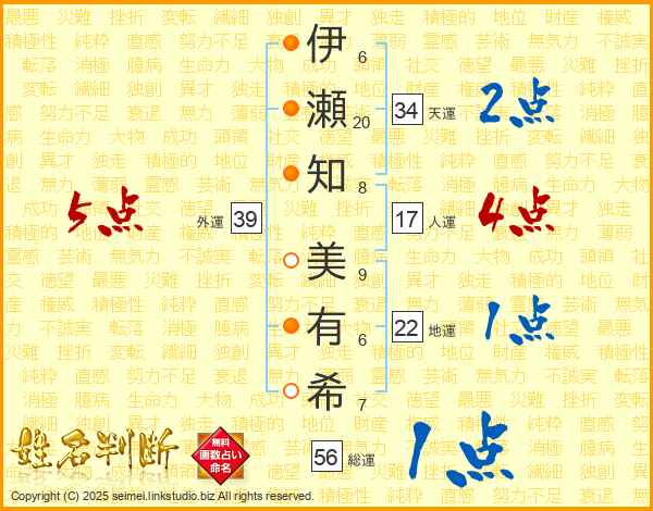 伊(6画)瀬(20画)知(8画) 美(9画)有(6画)希(7画)