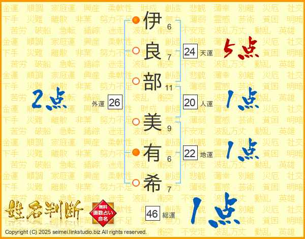 伊(6画)良(7画)部(11画) 美(9画)有(6画)希(7画)