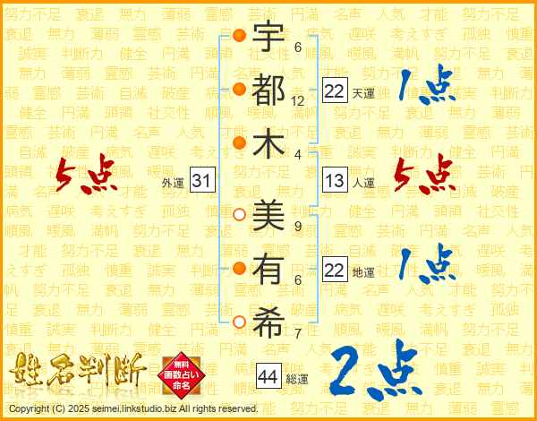 宇(6画)都(12画)木(4画) 美(9画)有(6画)希(7画)