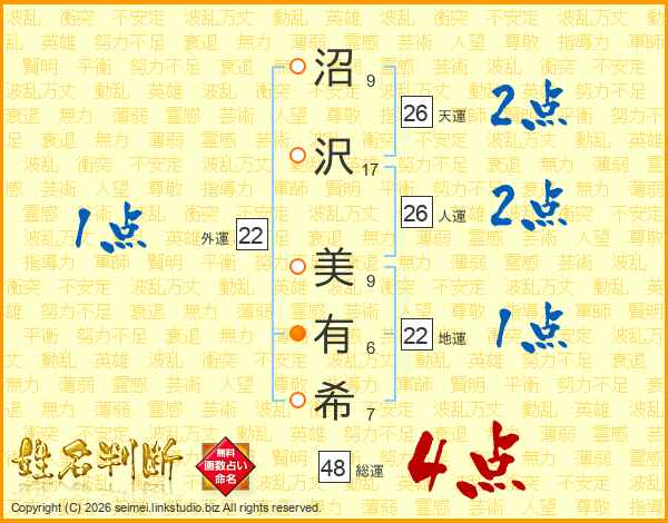 沼(9画)沢(17画) 美(9画)有(6画)希(7画)