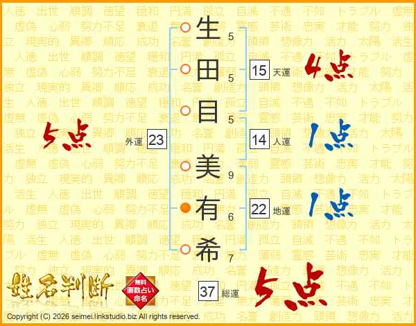 生(5画)田(5画)目(5画) 美(9画)有(6画)希(7画)