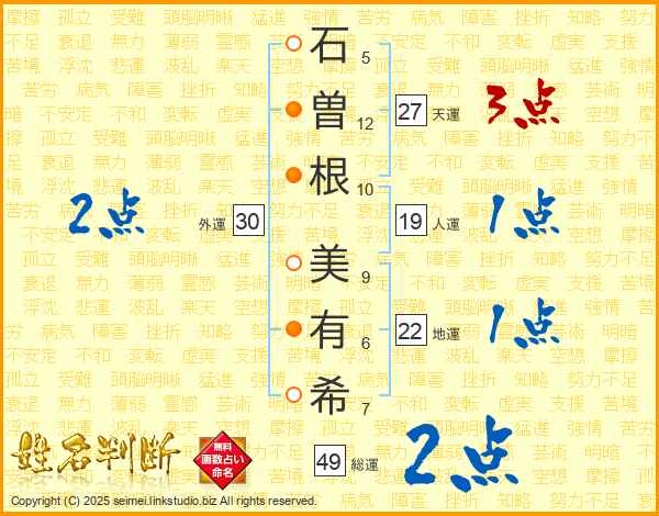 石(5画)曽(12画)根(10画) 美(9画)有(6画)希(7画)