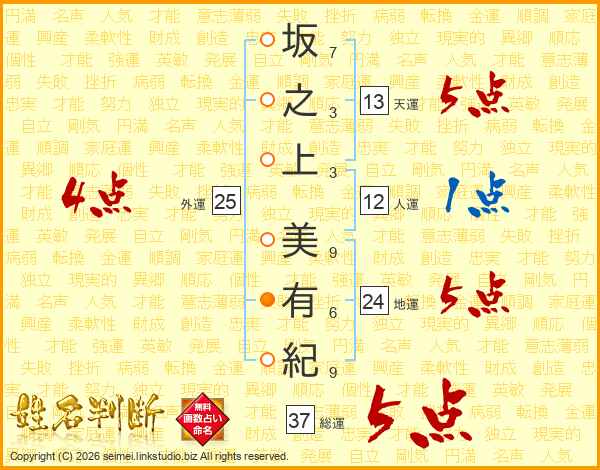 坂(7画)之(3画)上(3画) 美(9画)有(6画)紀(9画)