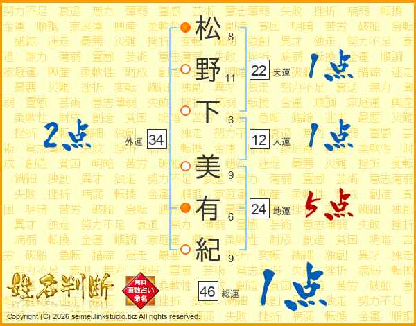 松(8画)野(11画)下(3画) 美(9画)有(6画)紀(9画)