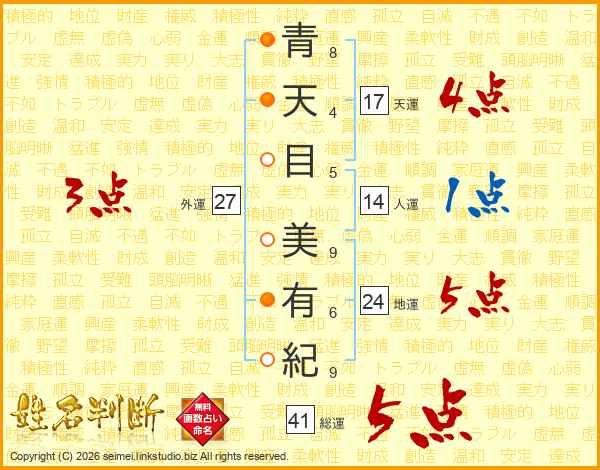 青(8画)天(4画)目(5画) 美(9画)有(6画)紀(9画)