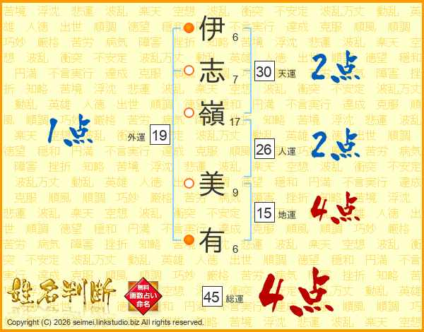 伊(6画)志(7画)嶺(17画) 美(9画)有(6画)