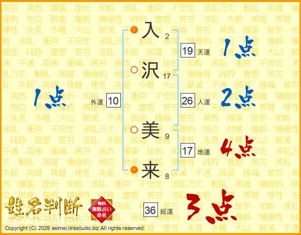 入(2画)沢(17画) 美(9画)来(8画)